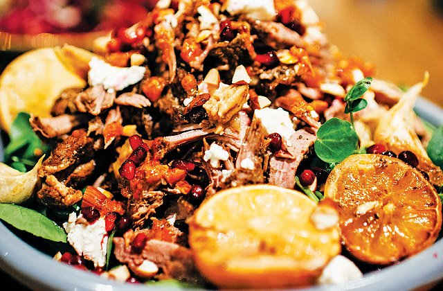 Remove the foil after five hours and cook, uncovered, for the last 40 minutes. When ready, the meat should be tender and falling off the bone. Gently shred the meat into large pieces and use the roasting juices to moisten the meat. You could serve the lamb as it is now without the dressing and it would be lip-smackingly lovely, or if you want to turn it into something very special, place on a platter and scatter with almonds, herbs and pomegranate seeds. Drizzle with the harissa dressing and dot with marinated goat’s cheese or labne.